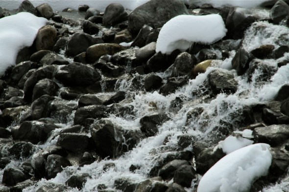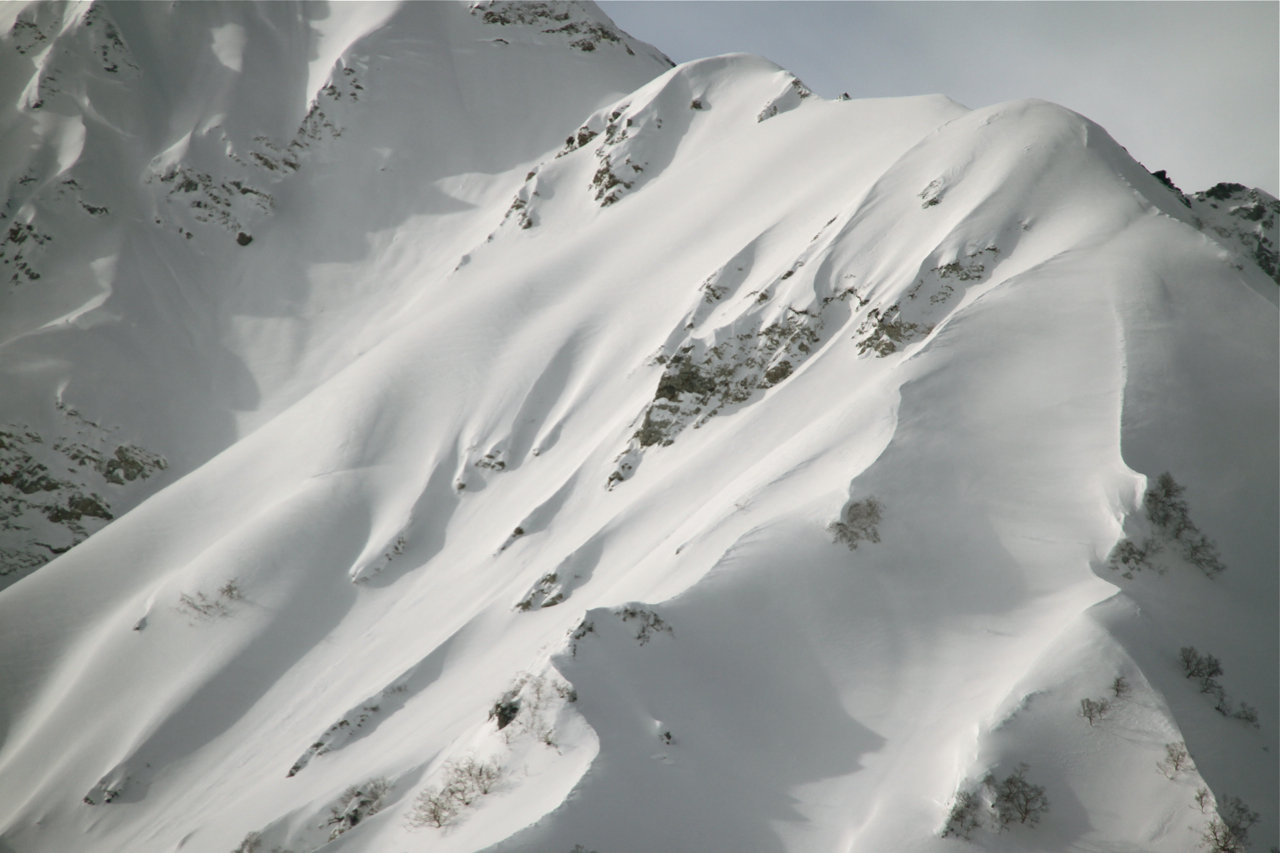 Our last day in Hakuba, we hiked above the lifts of Happo-One— the valley’s flagship ski area and site of the 1998 Olympic downhill runs— and dropped off of the north side for a 3,000 vertical foot descent. Although just a few inches of new snow had fallen, more had blown in on a stiff east wind, erasing all the tracks from the weekend.