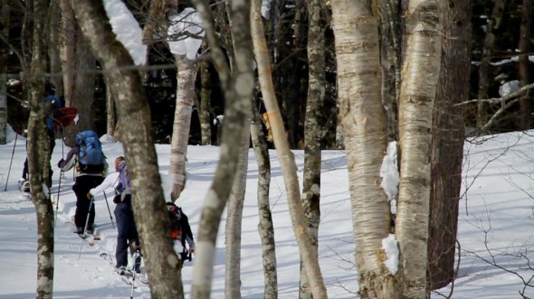 Just being outside surrounded by mountains and forest was enough to take our minds off our tired feet and burning lungs as we skinned. The sun shone nearly every day (Nate has an enviable goggle tan) and sometimes it would get legitimately hot, forcing us to stick to the shady north facing aspects for good snow. After hard, leg-burning days of resort skiing at Rusutsu and exhausting full day tours at Tokachidake, this style of skiing felt just right. An hour or two of climbing followed by a long descent and scenic traverse out along a riverbank suited us perfectly.