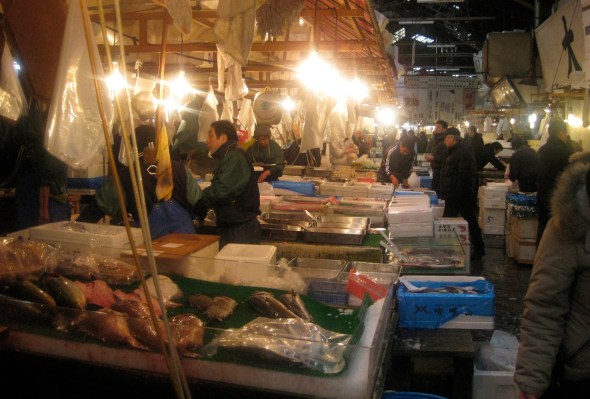 It was an impressive sight, but, mostly, we felt in the way. Stop for more than a second, and suddenly someone is trying to get by you or stack a container of fish right where you happen to be standing. Motorized carts zipped through the narrow aisles at alarming speeds, adding to the slightly stressful atmosphere and threatening to break our legs.