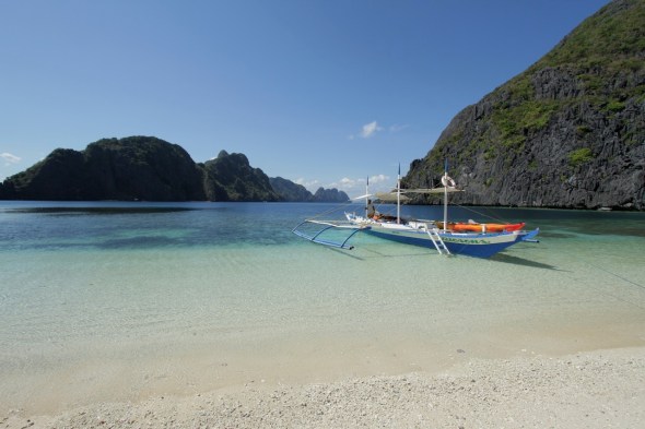 In the morning our group boarded the outrigger boat for a day of island hopping. Sitting in the shade of its awning, we all reveled in watching the islands roll by with absolutely no effort. Rounding the northern tip of Matinloc Island, we entered Tapiutan Strait, a beautiful channel between two rugged islands, which became our favorite stop of the day. Just a quick swim off the beach, a coral-studded shelf teeming with brightly colored fish dropped off into the deep blue water, and a gigantic sea turtle surfaced a few yards away from our kayak.