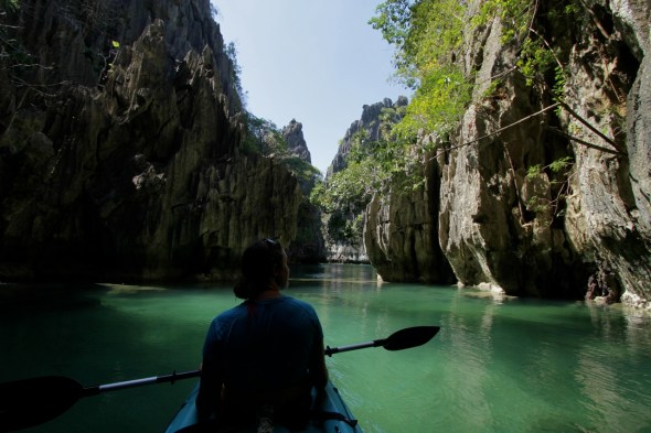 In the afternoon, we paddled into the blandly named Small Lagoon— Serge’s favorite spot in Bacuit Bay. Accessible only by a hole in the rocks large enough for a kayak, two pools of calm teal water spread beneath a circle of cliffs reminiscent of Vietnam’s Ha Long Bay.