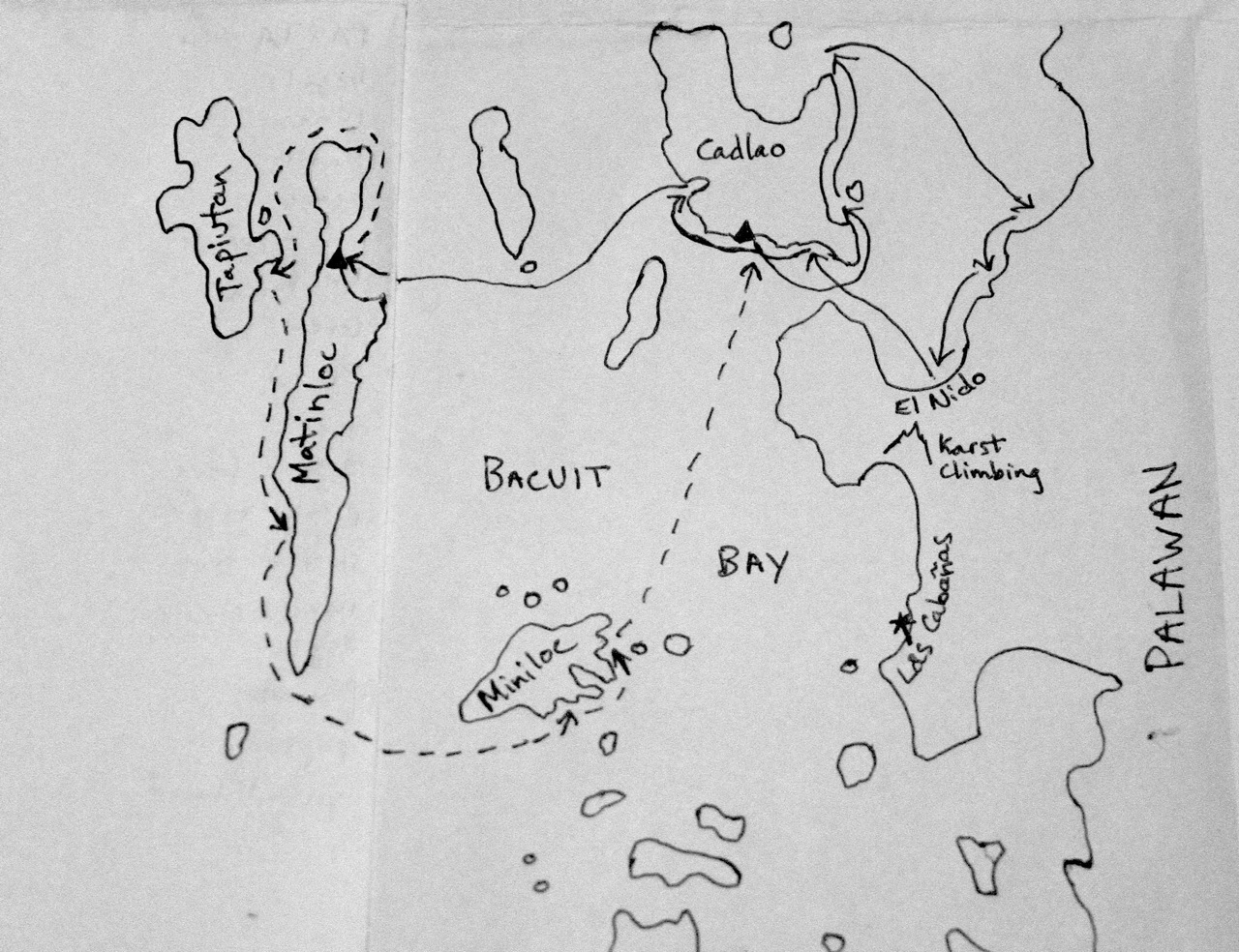 A map of our route: After leaving El Nido, a few stops on Cadlao Island before the long crossing to our campsite on Matinloc. Aboard the boat on the dotted line before being dropped on Cadlao for our second night. Up north, across the bay and back on day three.