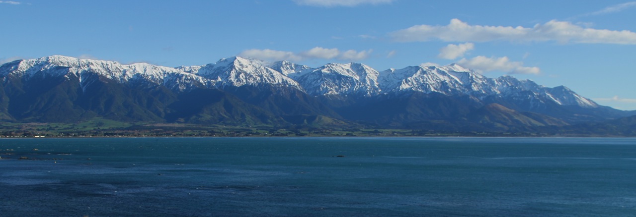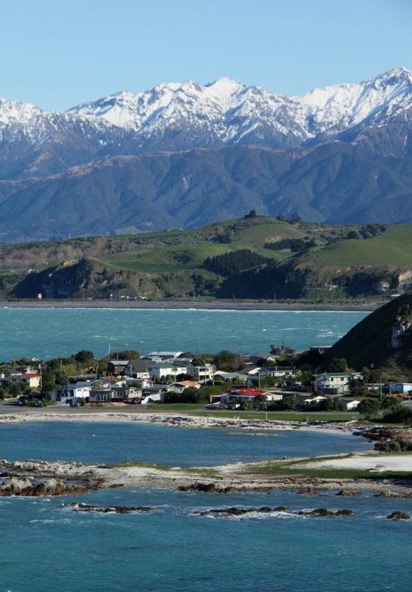 Highway 1 parallels the coast most of the way south from Blenhiem, with rugged mountains rising to the right of the choppy, cold South Pacific. We arrived in coastal Kaikoura in the early afternoon to moody weather— wind-driven rain, plain old wind, and warm late day sunshine.