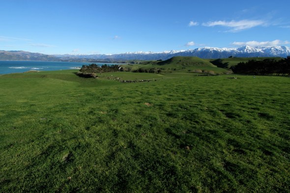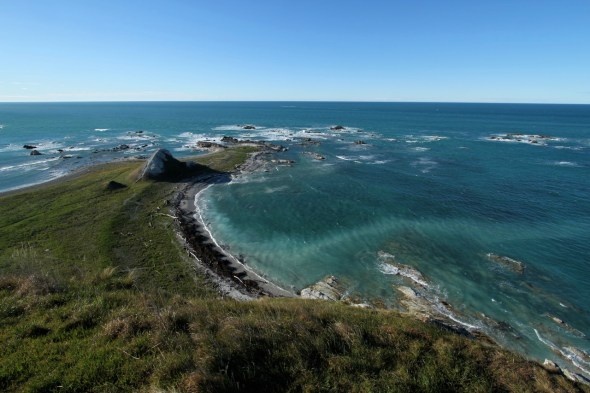 The next morning brought clear skies and slightly abated southerly winds. Kaikoura lies at the base of a small, solitary peninsula, which rolls out into the sea in a patchwork of hilly green pastures. At the weather-worn seaward end, high crumbling cliffs drop away into roiling turquoise surf, the inviting color disguising the assuredly frigid water.
