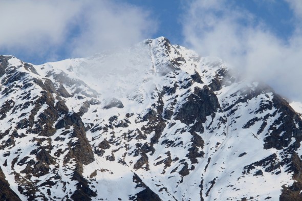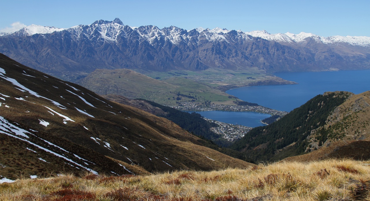 The trail gained a saddle and curved around to the snowless west ridge, and after several hours of huffing and puffing and commenting on our sad state of fitness, we reached the summit. The views were simply incredible. The many-armed Lake Wakatipu unfolded directly below us, bright blue in the afternoon sun. Queenstown was tucked into a corner between the lake and the hills, and parasailers drifted above the harbor, their brightly colored parachutes contrasting against the vibrant lake. Enormous snowy mountains circled us entirely, rising up from every side.