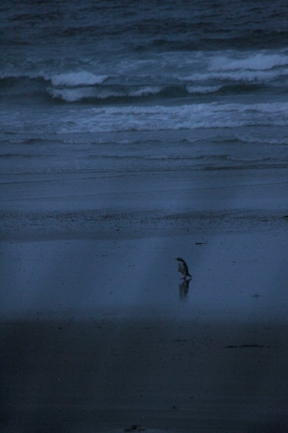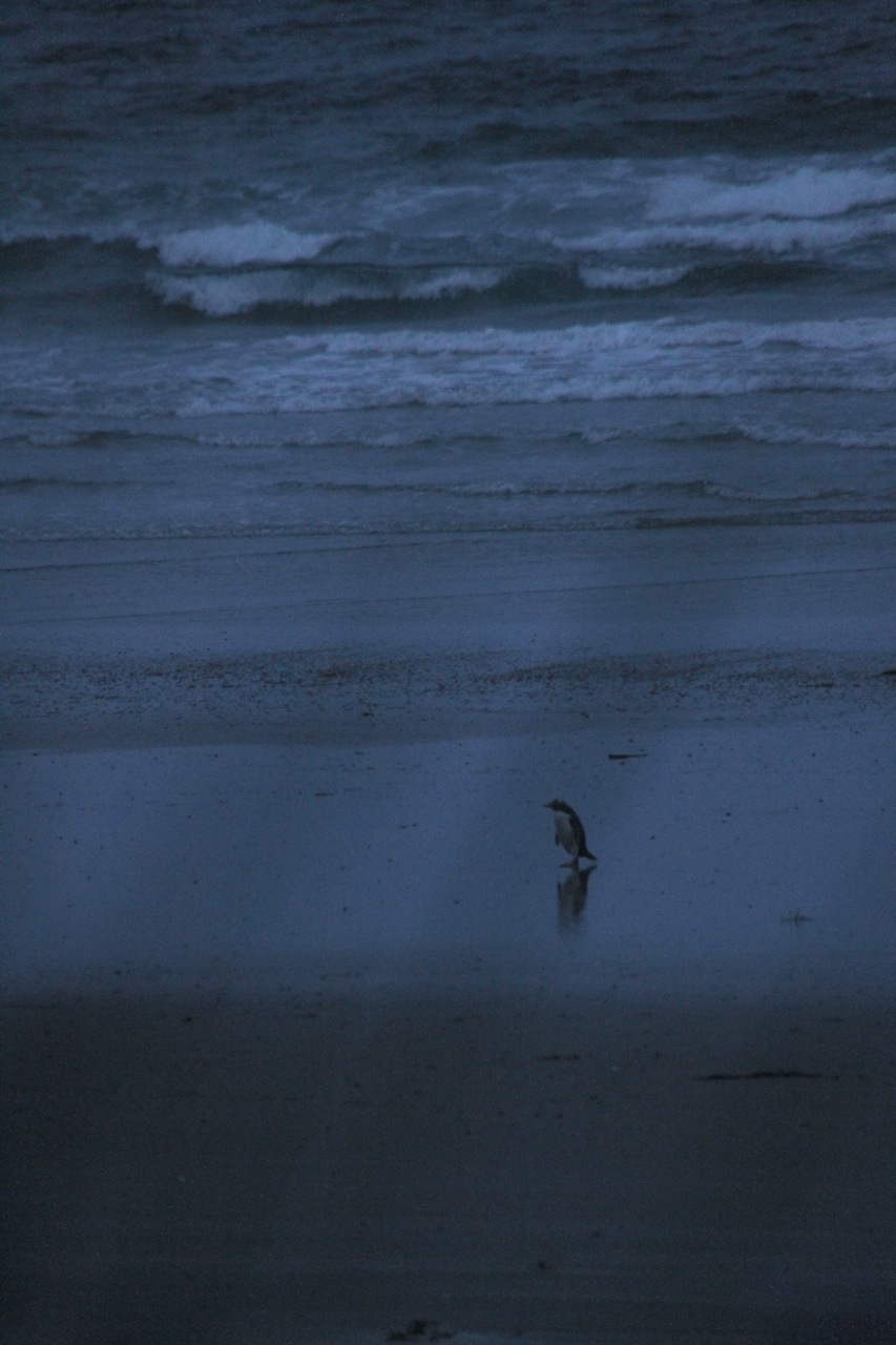 Yesterday at dusk we headed for the far end of a long, windswept beach, and sat out of sight among some dune grass. Eventually, two tiny penguins emerged from the surf and waddled up the beach one by one, no more than knee height. Slowly shuffling across the beach to their nests, they looked remarkably like the unsteady drunk students wandering Dunedin the night before after the All Blacks Rugby World Cup victory.