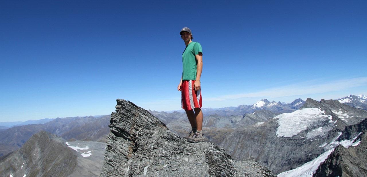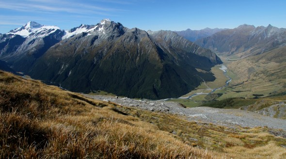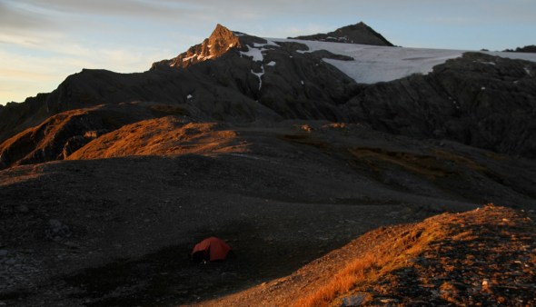 A small hollow at the top of the ridge makes for a perfect campsite: just enough protection from a stiff east wind, and incredible views across the valley to Mount Aspiring.
