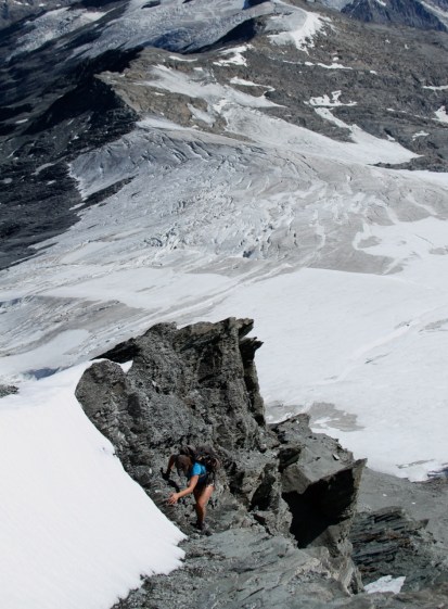 A few hours later, we stand atop the lower northeast peak. The precipitous east face drops into the arc of the river valley far below.