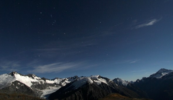 A full moon rises, and the Southern Cross and Orion dominate the bright night sky.